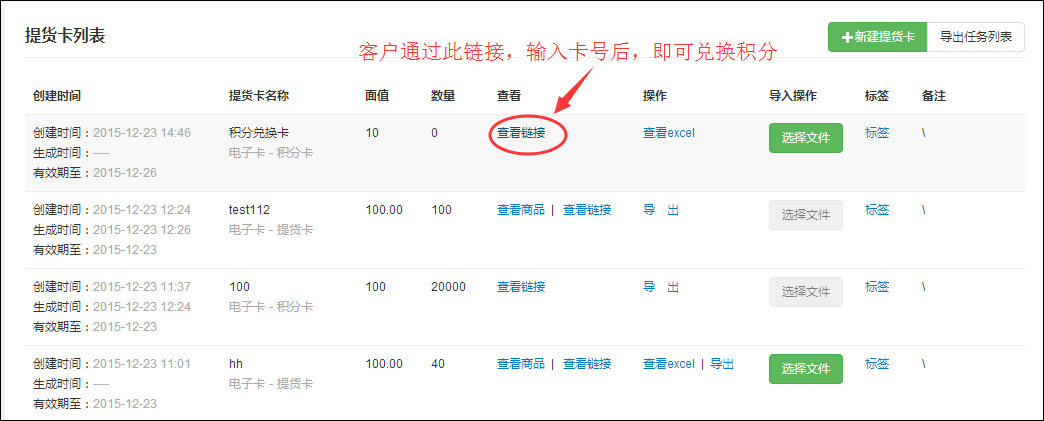 3.积分卡创建成功后,与商品功能卡同理,生成后即可导出或将已有的卡号发放给客户