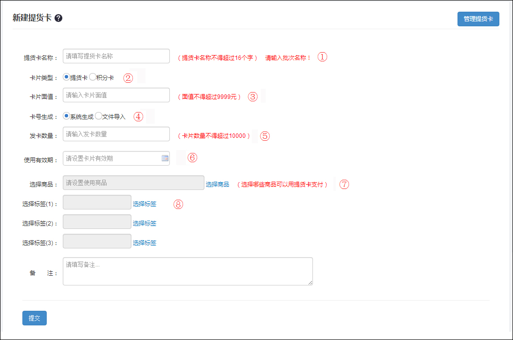 系统自动生成卡号或商家自主导入卡号两种形式;